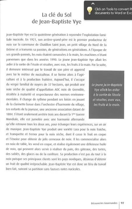 Jean-Baptiste Vye est la quatrième génération à reprendre l'exploitation familiale nucicole. En 1921, son arrière-grand-père est le premier producteur de noix sur la commune de Chatillon Saint Jean, un petit village du Nord de la Drome et a transmis sa passion, de générations en générations. À l'époque de ses grands-parents, les noix étaient ramassées à la main, les machines n'étant parvenues que dans les années 1990. Le jeune Jean-Baptiste Vye allait les aider à la sortie de l'école et récolter, avec eux, les fruits à la main. Par la suite, il demeure Intéressé par le travail de son père et apprend avec lui le métier de nuciculteur. Il se forme alors à l'agriculture et à la production fruitière. Aujourd'hui, il s'occupe du verger familial de noyers de 37 hectares, qui produit une noix sèche de qualité d'appellation AOC noix de Grenoble, récoltée à maturité et respectueuse des normes environnementales. Il change de rythme pendant ses loisirs en jouant de la clarinette basse dans l'orchestre d'harmonie du village, les enfants de la joyeuse, une ancienne association datant de 1884. S'étant seulement arrêtée trois ans durant la 1ʳᵉ Guerre Mondiale, elle est jumelée avec une harmonie allemande qu'elle retrouve tous les deux ans, pour échanger leurs expériences, sur un air de musique. Jean-Baptiste Vye produit une variété tara pour la noix fraiche, et Franquette et Fernor pour la noix sèche, dont il casse le fruit en coque et l'énoise pour obtenir de jolis cerneaux de noix. Il les commercialise alors en noix de table, les vend en coque, et réalise également une délicieuse huile de noix, qui peuvent alors servir à réaliser du pain, des gâteaux, des tartes, des sablés, des glaces ou de la confiture. Sa production n'est pas du tout à la noix puisque ses principaux clients sont les pays nordiques, désireux d'obtenir un fruit de qualité irréprochable. Jean-Baptiste Vye est donc un féru du travail bien fait, suivant sa partition sans fausses notes nucicoles.