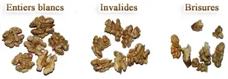 Les noix sont cassées et énoisées mécaniquement: l’amande est extraite de sa coquille. Les cerneaux sont triés par catégories :