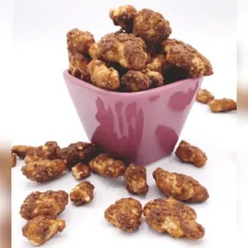 Les noix décortiquées (cerneaux) sont enrobés de sucre dans une pralinière en cuivre qui tourne doucement afin que le sucre se cristallise et entoure le cerneau.