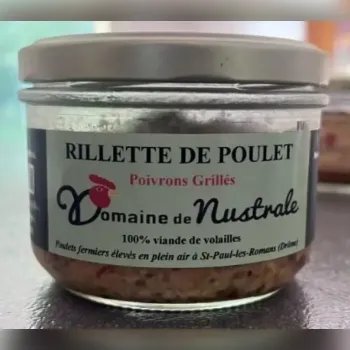 Nous vous proposons des pots de rillettes de 180g. Vous avez le choix entre la rillette de poulet aux tomates séchées ou la rillette de poulet aux poivrons grillés.